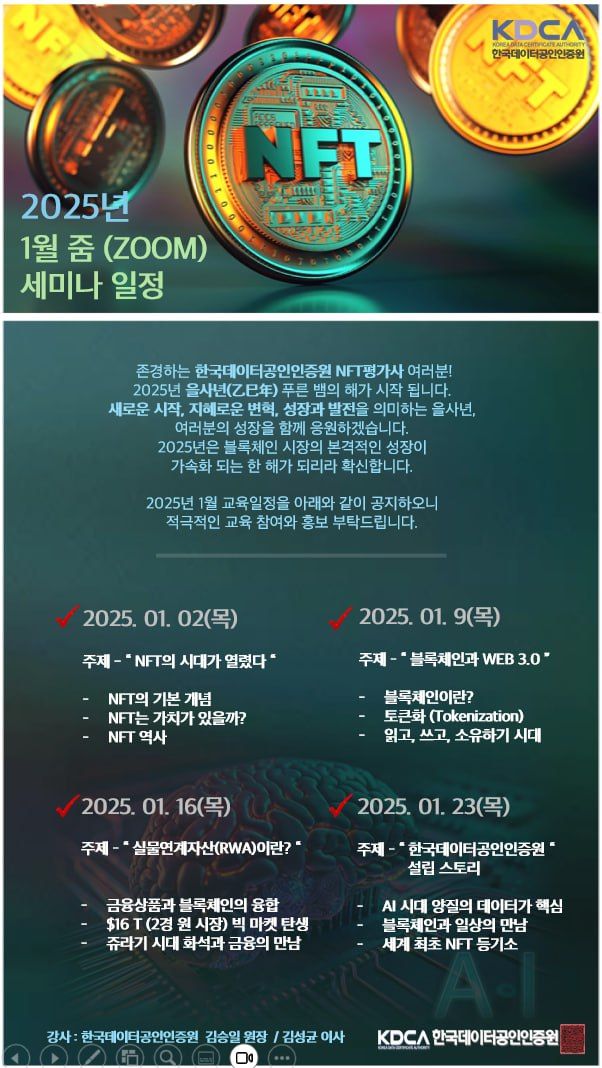 2025년 1월 줌(Zoom) 세미나 일정 안내 시스템관리자 2025.01.02 15:52 3,954 존경하는 한국데이터공인인증원 NFT평가사 여러분!2025년 을사년(乙巳年) 푸른 뱀의 해가 시작됩니다.새로운 시작, 지혜로운 변혁, 성장과 발전을 의미하는 을사년,여러분의 성장을 함께 응원하겠습니다.2025년은 블록체인 시장의 본격적인 성장이 가속화되는 한 해가 되리라 확신합니다.2025년 1월 교육일정을 위와 같이 공지하오니 적극적인 교육 참여와 홍보 부탁드립니다.감사합니다.