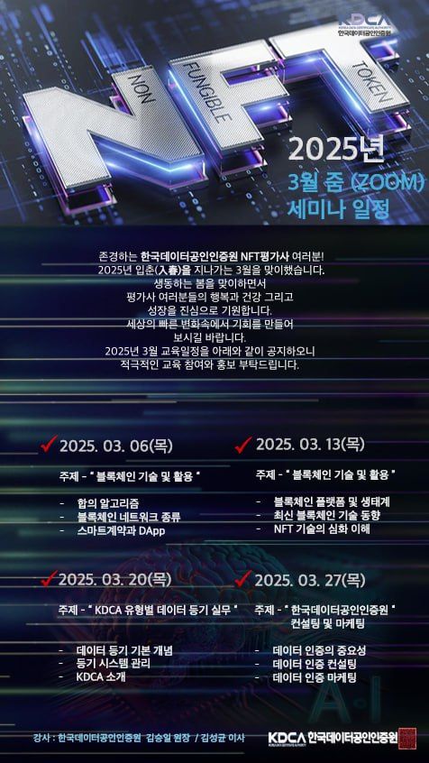 2025년 3월 줌(Zoom) 세미나 일정 안내 시스템관리자 2025.03.04 16:42 3,781 존경하는 한국데이터공인인증원 NFT평가사 여러분!2025년 입춘(入春)을 지나가는 3월을 맞이했습니다.생동하는 봄을 맞이하면서평가사 여러분들의 행복과 건강 그리고성장을 진심으로 기원합니다.세상의 빠른 변화 속에서 기회를 만들어 보시길 바랍니다.2025년 3월 교육 일정을 위와 같이 공지하오니적극적인 교육 참여와 홍보 부탁 드립니다.감사합니다.