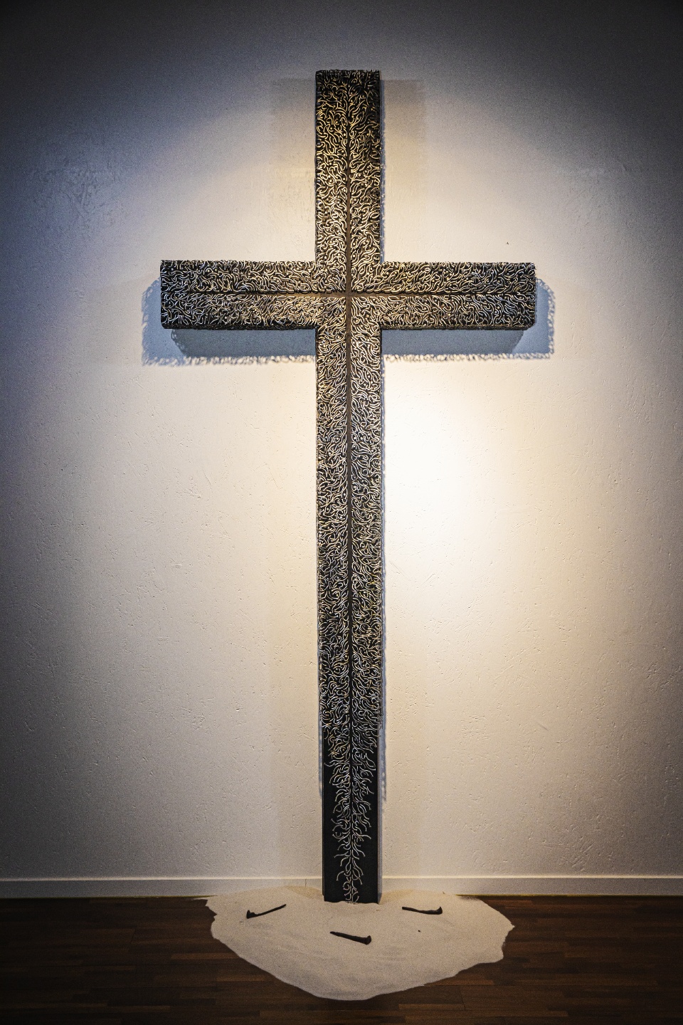 " 세걔의 대못과 만개의 못을 나무에 박아 만들어진 십자가"